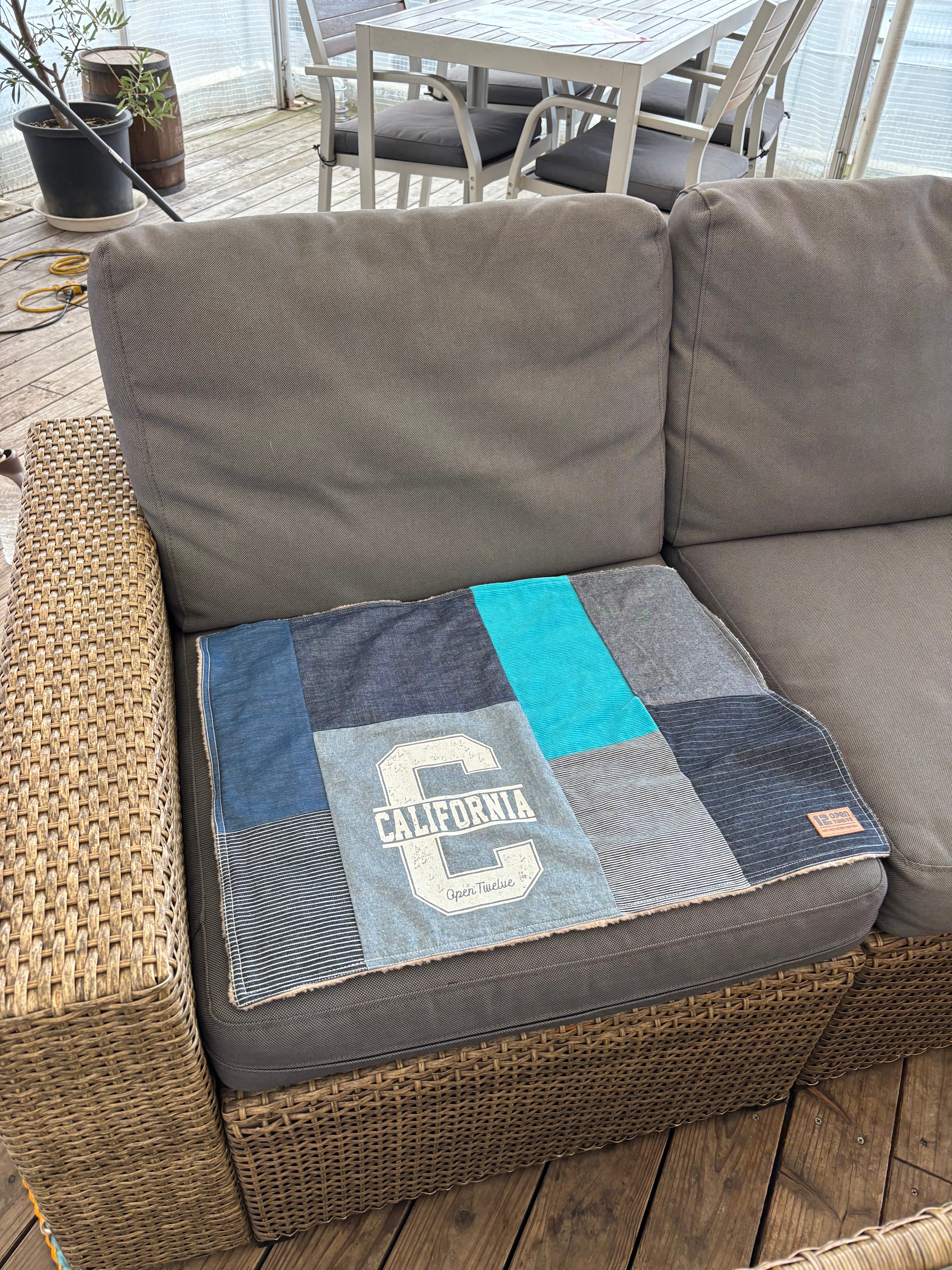 デニム、シャンブレー、ヒッコリー、コーデュロイを使用したリメイク風パッチワーク【カフェマット】になります♪
