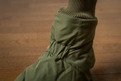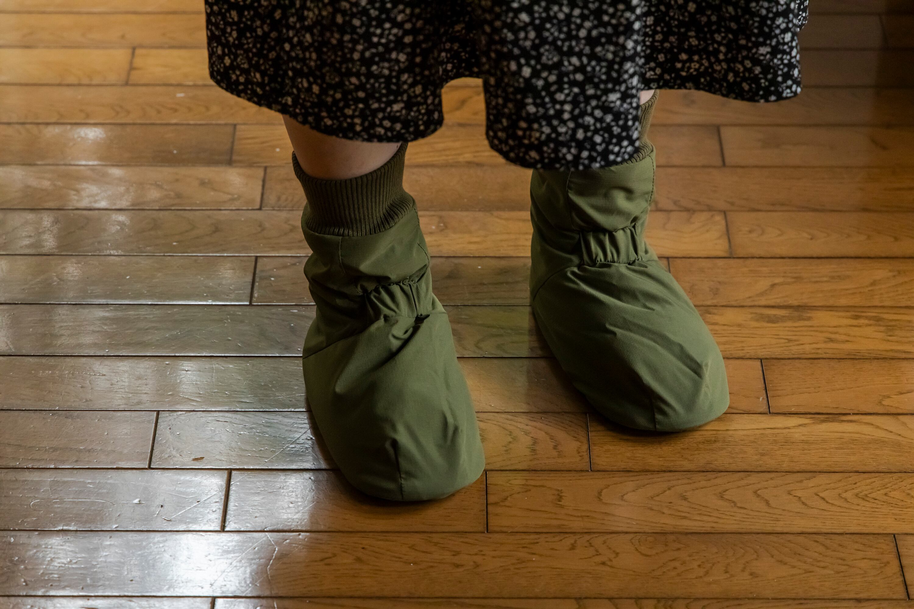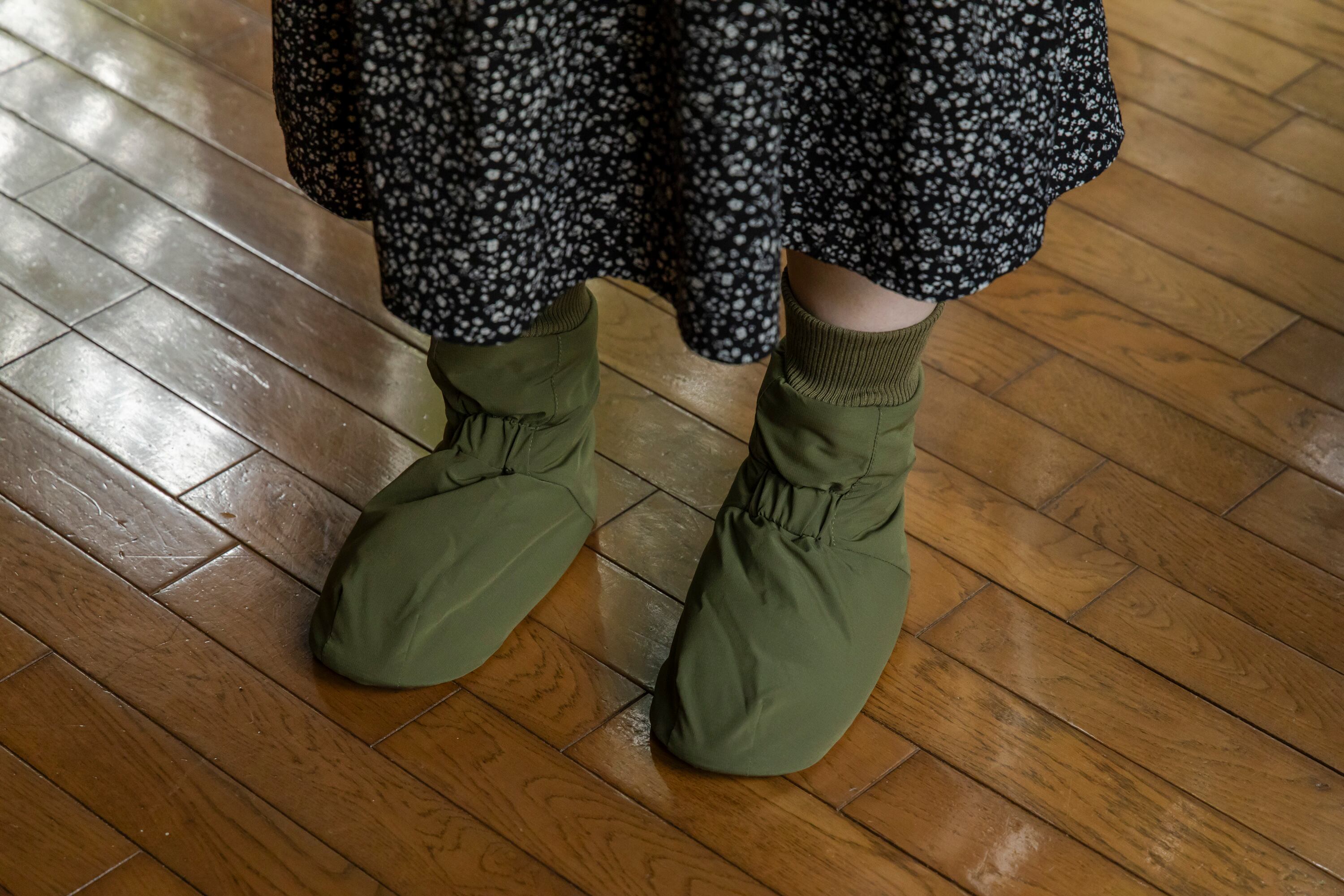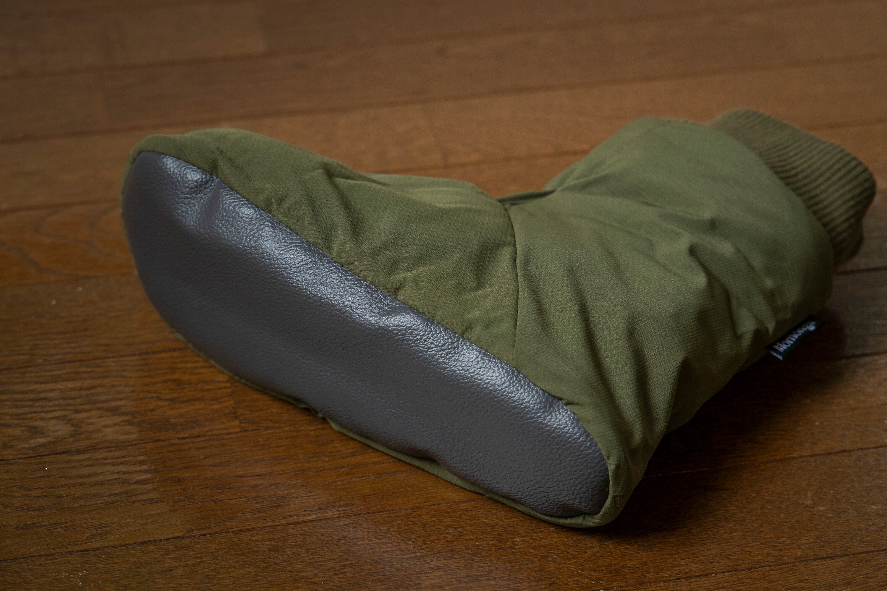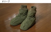 アウトドアではテントの中で足先を暖めるテントシューズが一般的ですが、もっと楽に履けるよう靴下風のデザインになっています。モモンガと同じ5層構造で、中綿はサーモライト中綿、裏地は保温裏地を使っています。内底はボアで暖かく、外底はフェイクレザーで滑りにくくなっています。(外履き用ではありません。テント内や室内でご使用ください。)