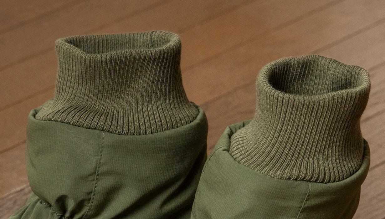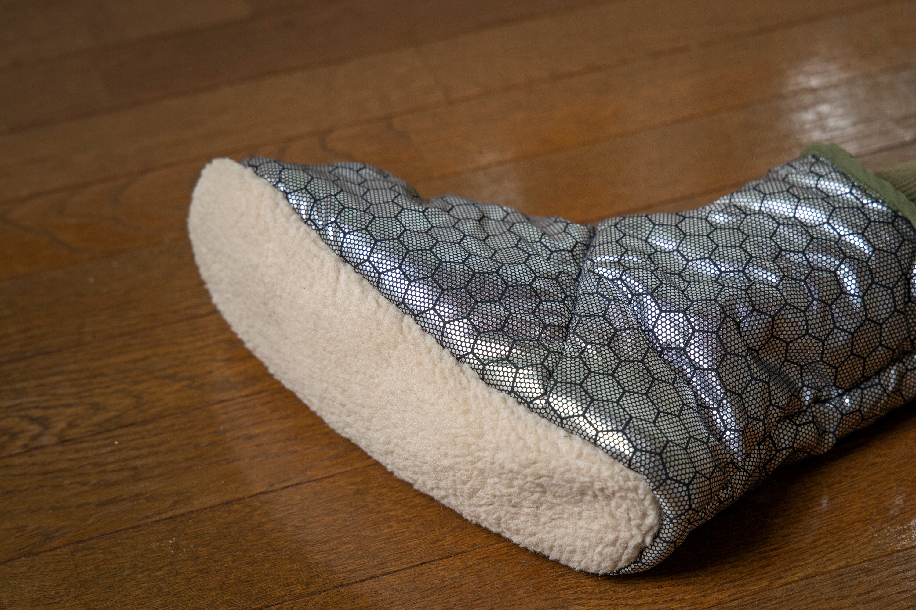モモンガと同じ5層構造ですが、中綿分量はモモンガより厚手のサーモライト中綿を使用し、裏地は保温裏地を使っています。