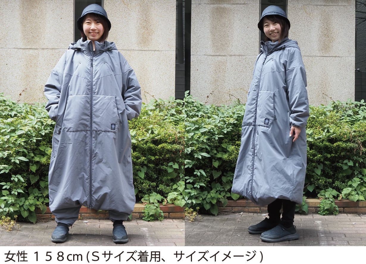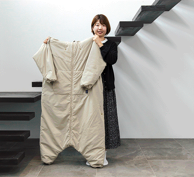 封筒型寝袋から着想したモモンガはロングスカートでもスーツでもそのまま上から重ねて簡単に着用できます。