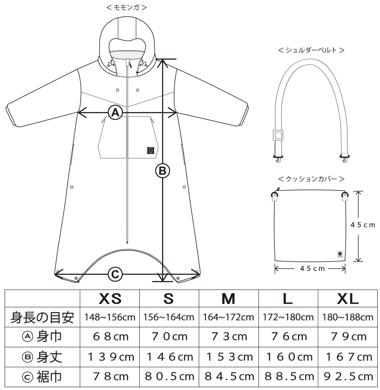 *「モモンガ」は上着などの上からでも着ていただけるよう、身巾などにはかなりゆとりをもったデザインの為、身長に合わせたサイズ選びを推奨させていただいております。
