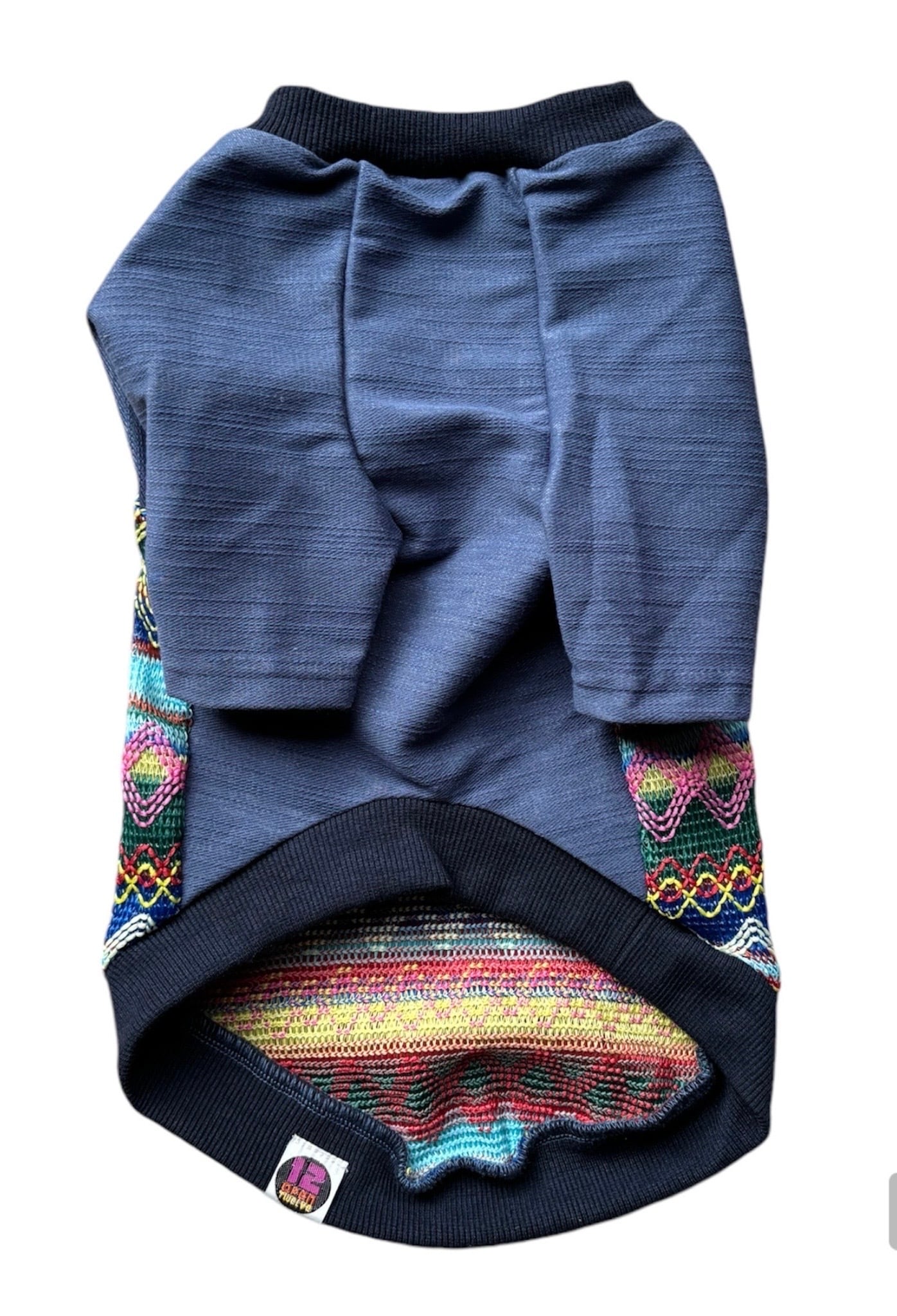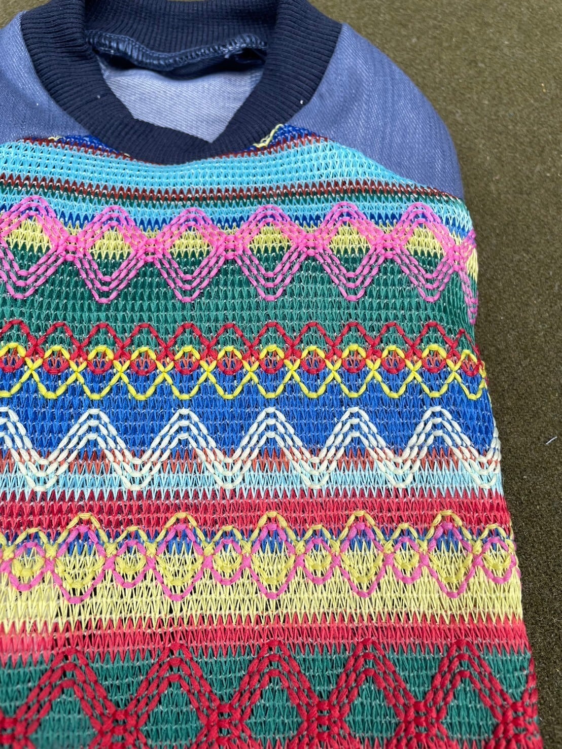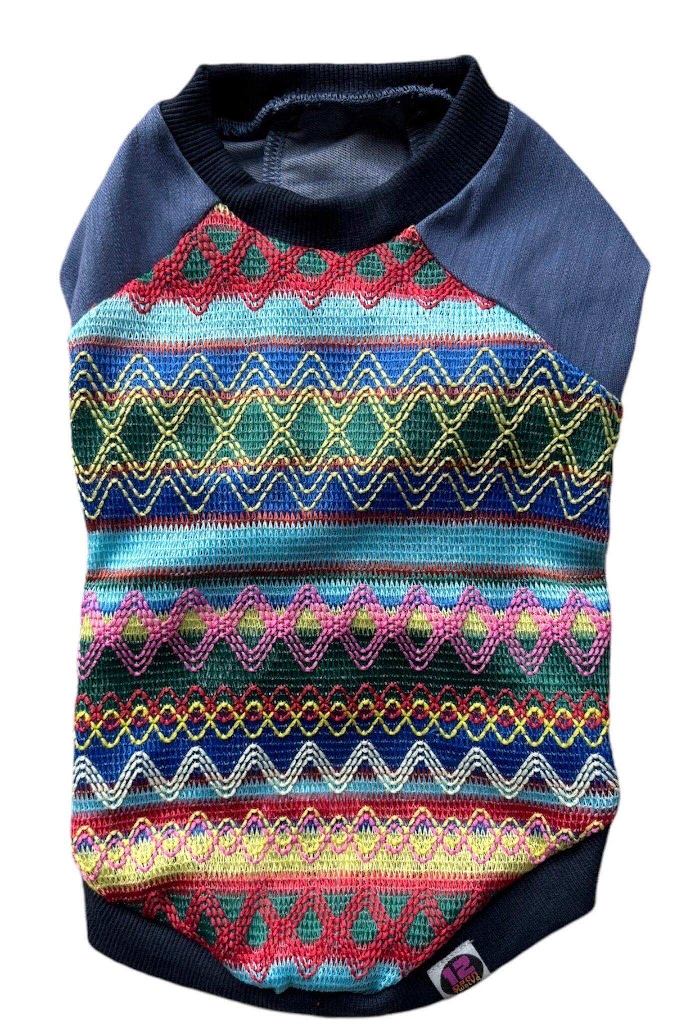 インパクト抜群で可愛く、ストレッチ性のある「エスニックジャガード」生地を背中に使用したラグランTシャツタイプになります。袖もストレッチ素材なので脱ぎ着もしやすくオススメの1枚です♪